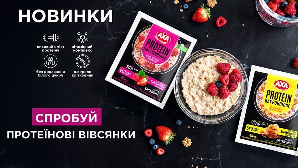 АХА представляє нову лінійку протеїнових вівсяних каш AXA у двох смаках малина–полуниця та банан–карамель.